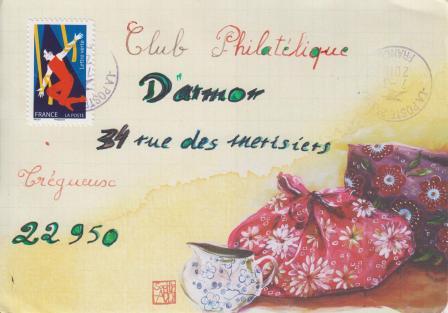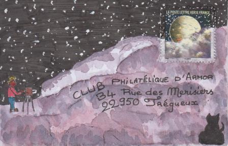 Précision : le timbre doit être incorporé au dessin ou prolongé dans le dessin. Ce timbre n'a pas à être collé en haut à droite comme un courrier normal. Vous le collez où vous voulez pour qu'il s'intègre bien au centre de votre oeuvre.
